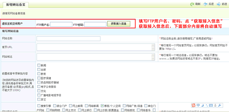 若您填写了ftp用户名和密码,点击获取接入信息之后,您就不用填写首页URL、网站域名、服务器放置地点、接入方式和ip地址,您只需要填写网站名称即可。